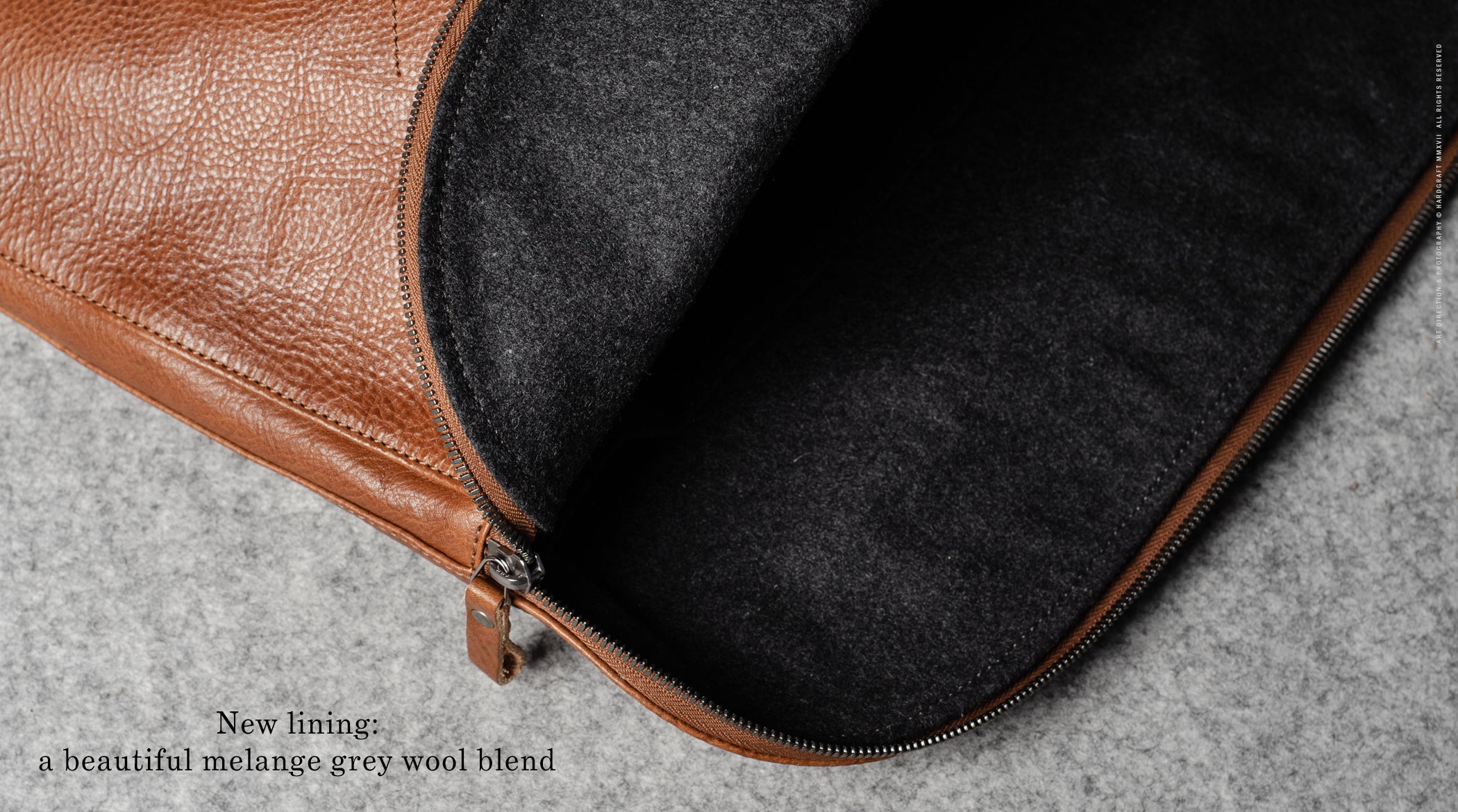 Soft by nature our luxurious Italian wool blend lining adds a tactile and lush interior that almost feels too good to hide away inside the bag. Our natural wool gets a little support from it's stronger and very resilient man-made fibres to stand up to whatever you throw into it.