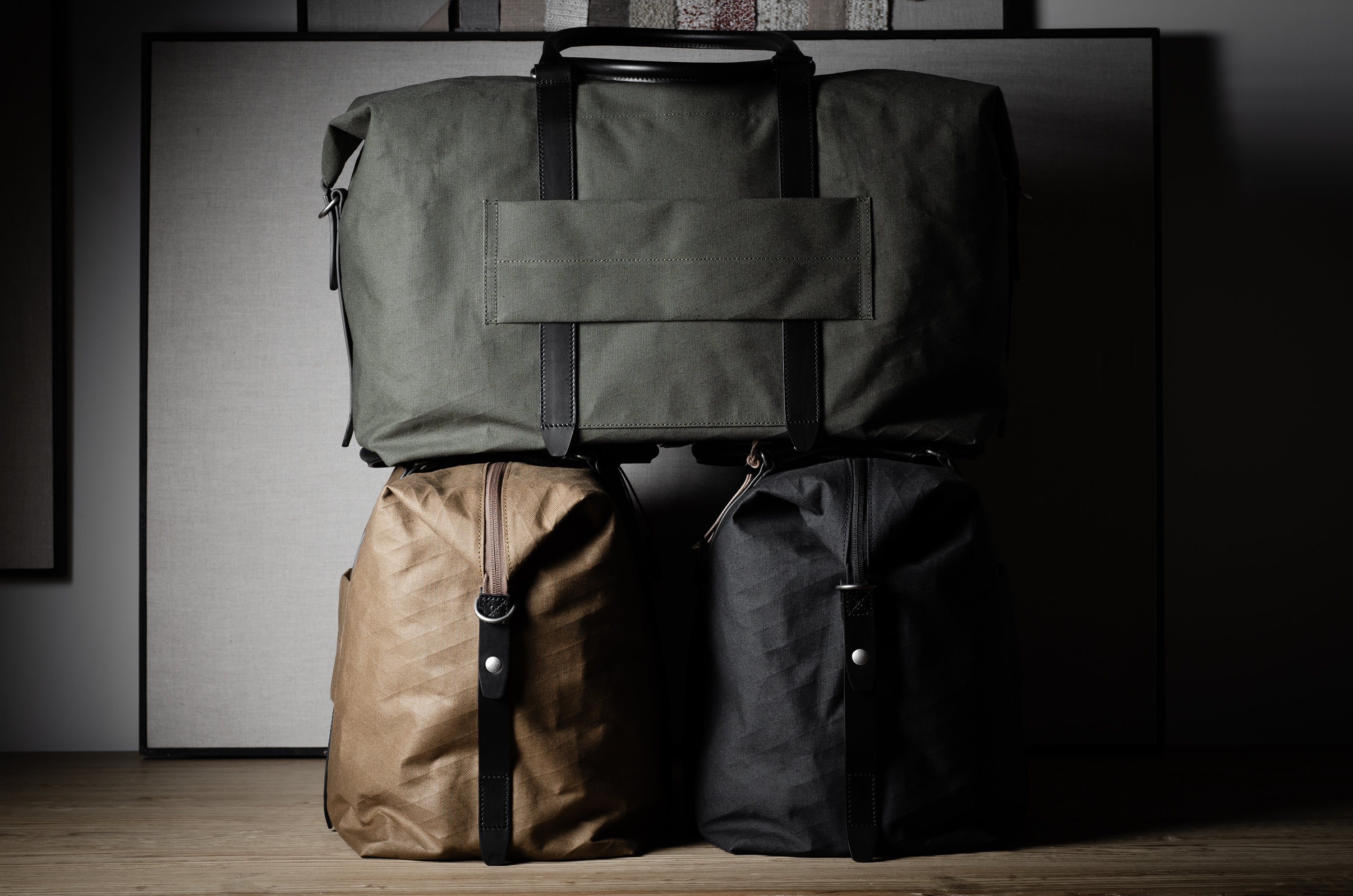 Inspired by advanced sailcloth technology this layered material is durable, resilient, weatherproof and high-tech. The natural organic duck cotton face is combined with a double layer laminate construction to achieve ultimate strength, lightness and weatherproofness. 100% climate neutral.