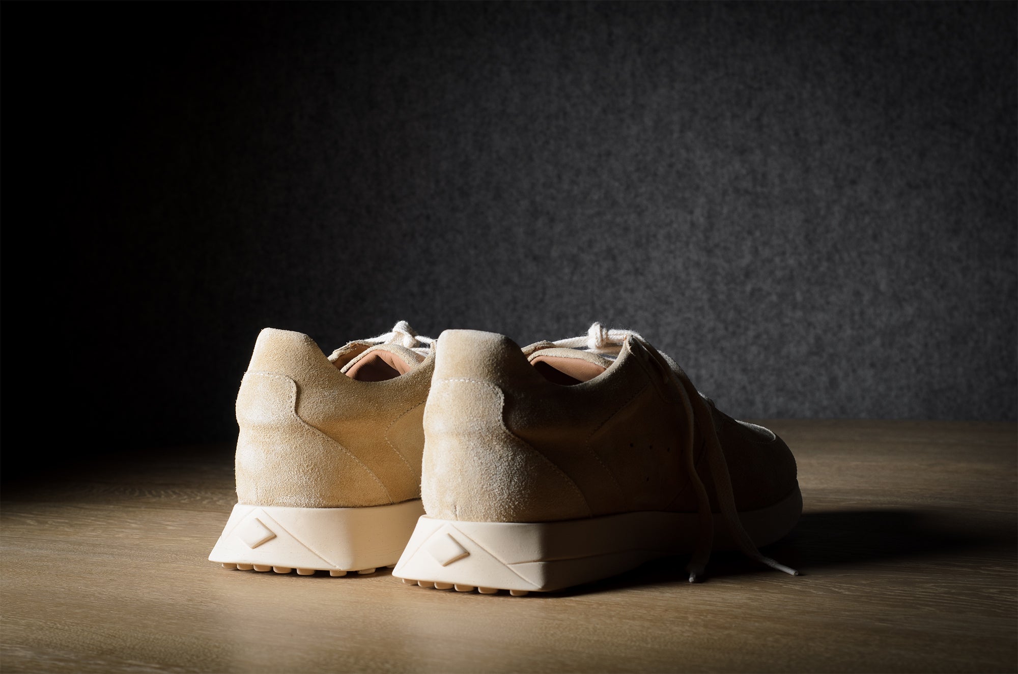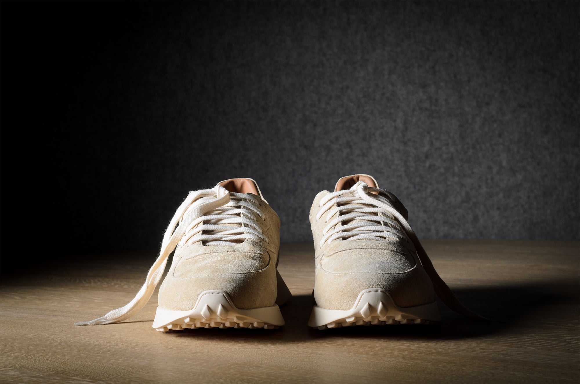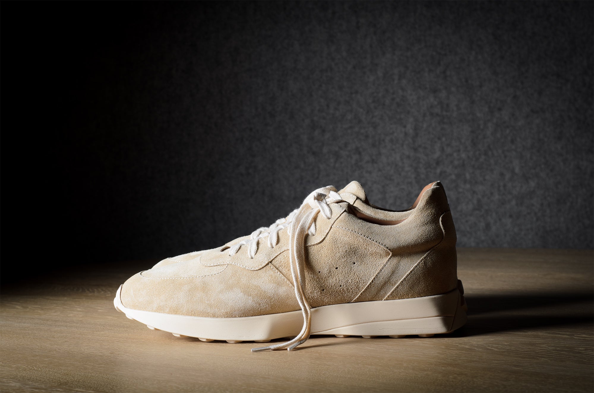 Der R1 Sneaker orientiert sich an einem modernen Laufschuh, bleibt aber mit seinen handgefertigten Techniken und nichttechnischen Materialien fest in der Werkstatt verankert. Lebe langsam und gehe, renne nicht.