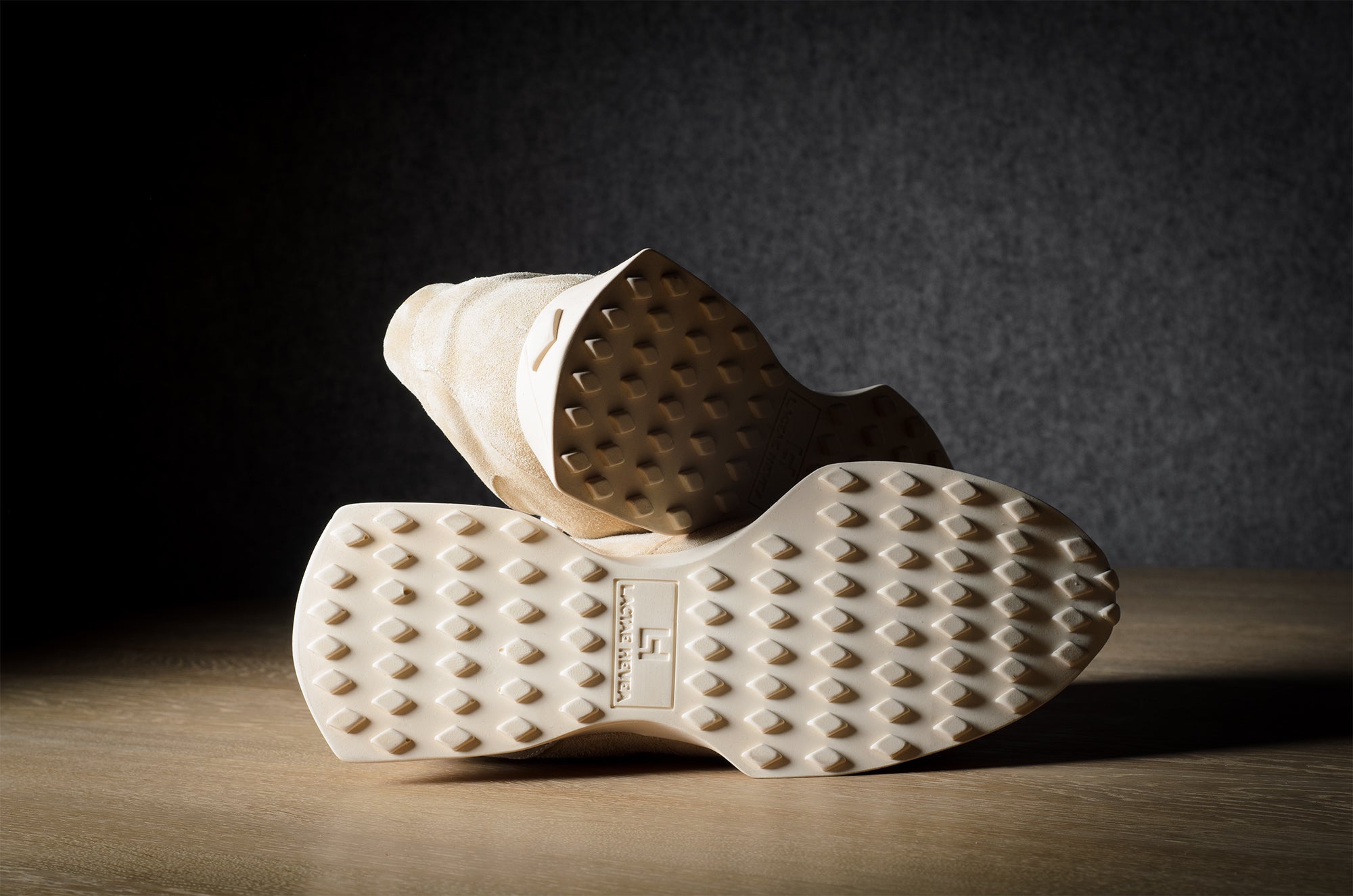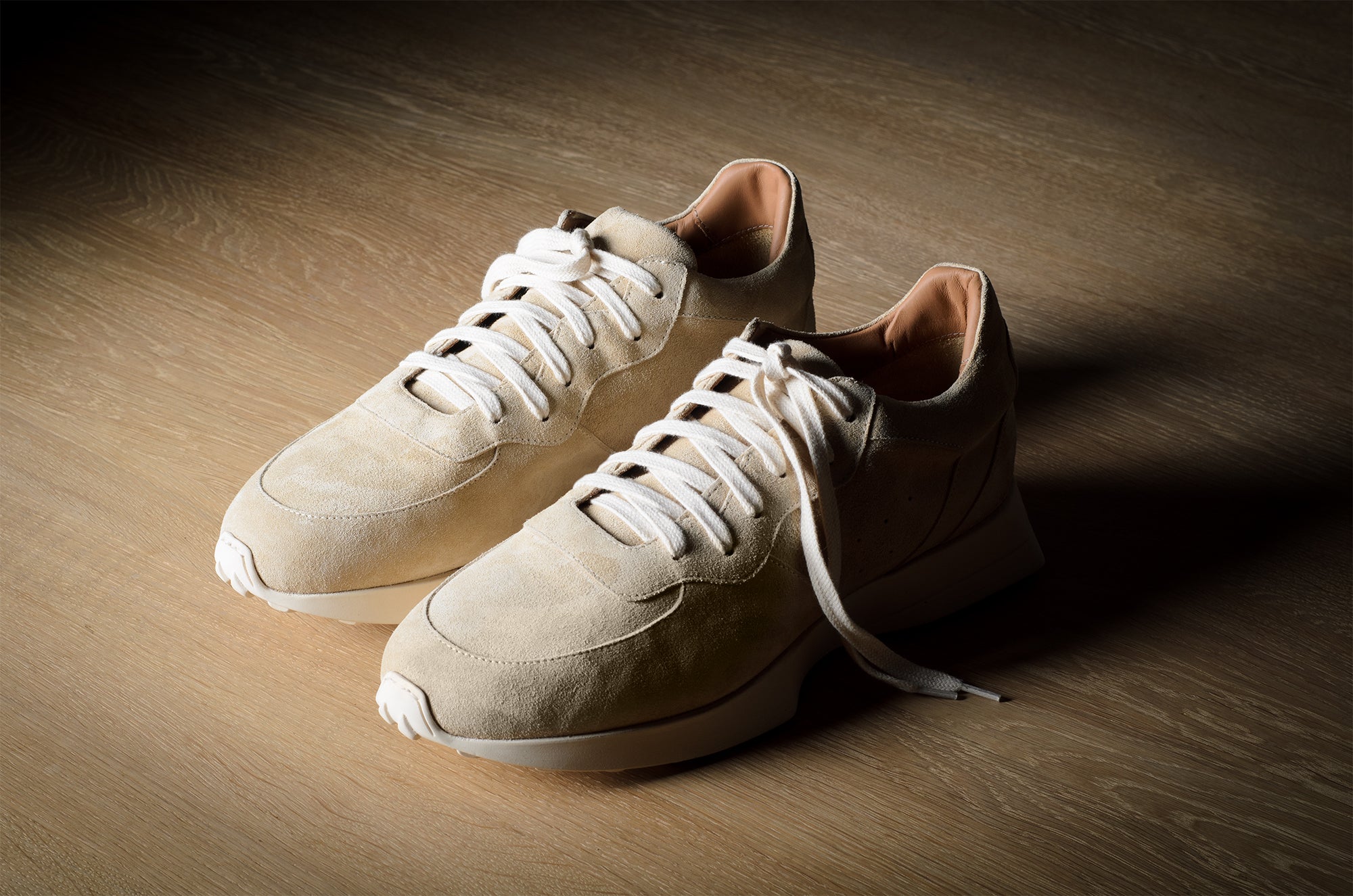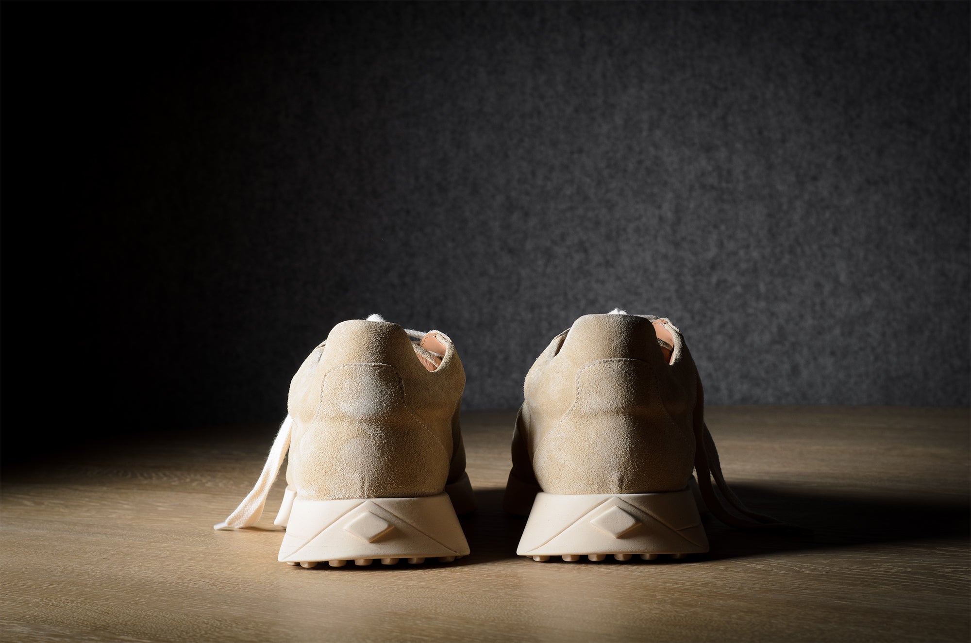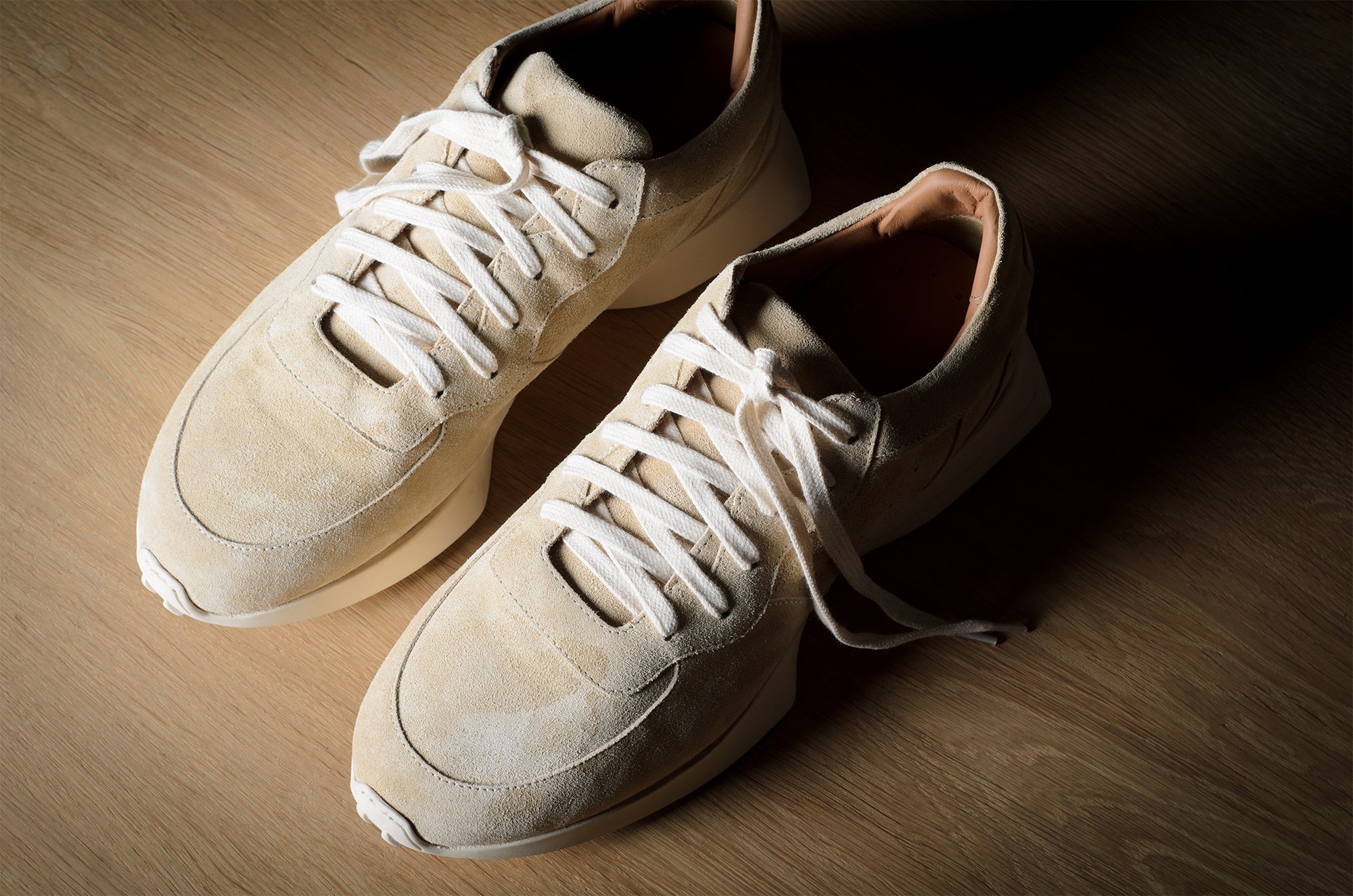 Der R1 Sneaker orientiert sich an einem modernen Laufschuh, bleibt aber mit seinen handgefertigten Techniken und nichttechnischen Materialien fest in der Werkstatt verankert. Lebe langsam und gehe, renne nicht.