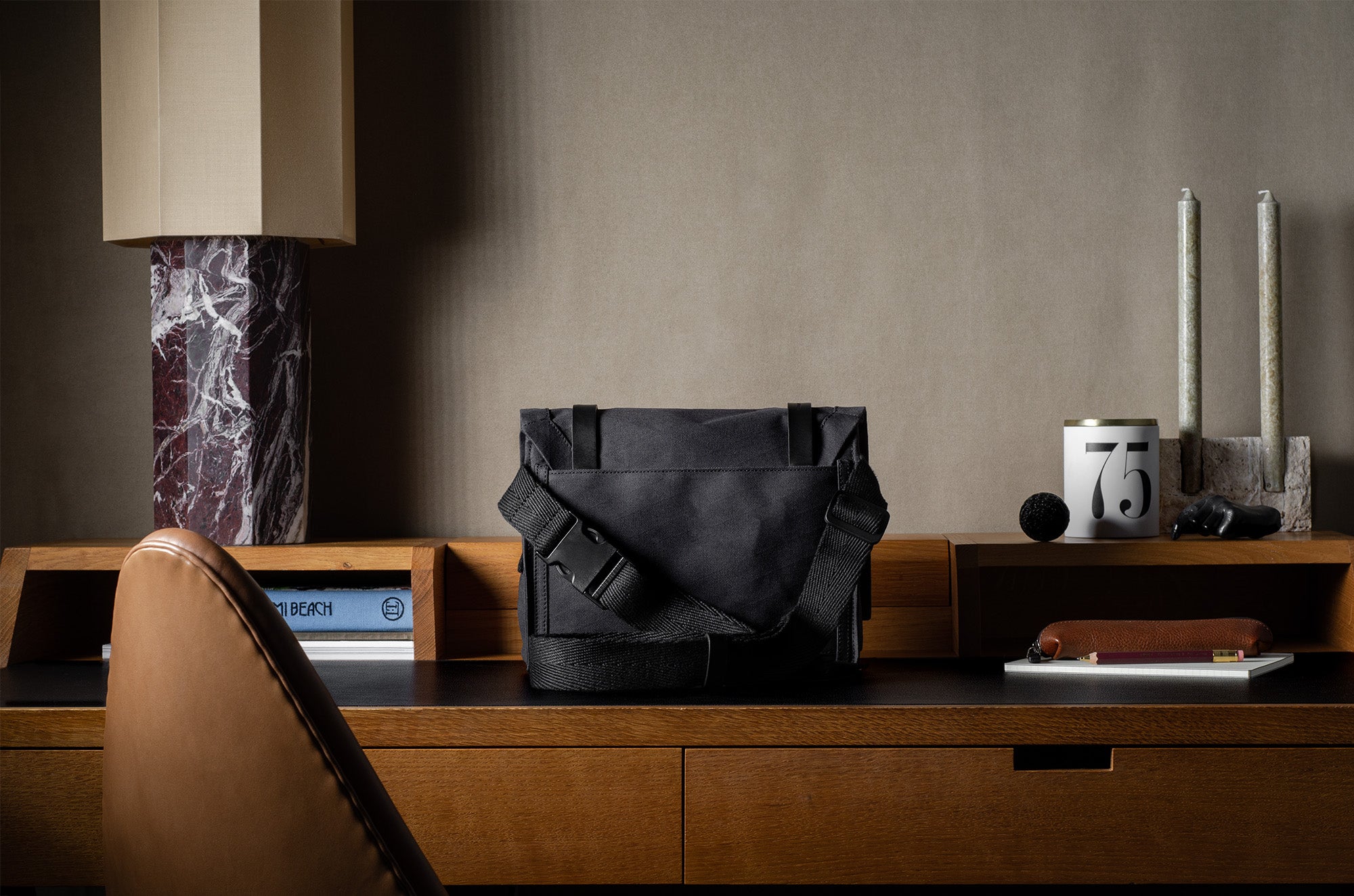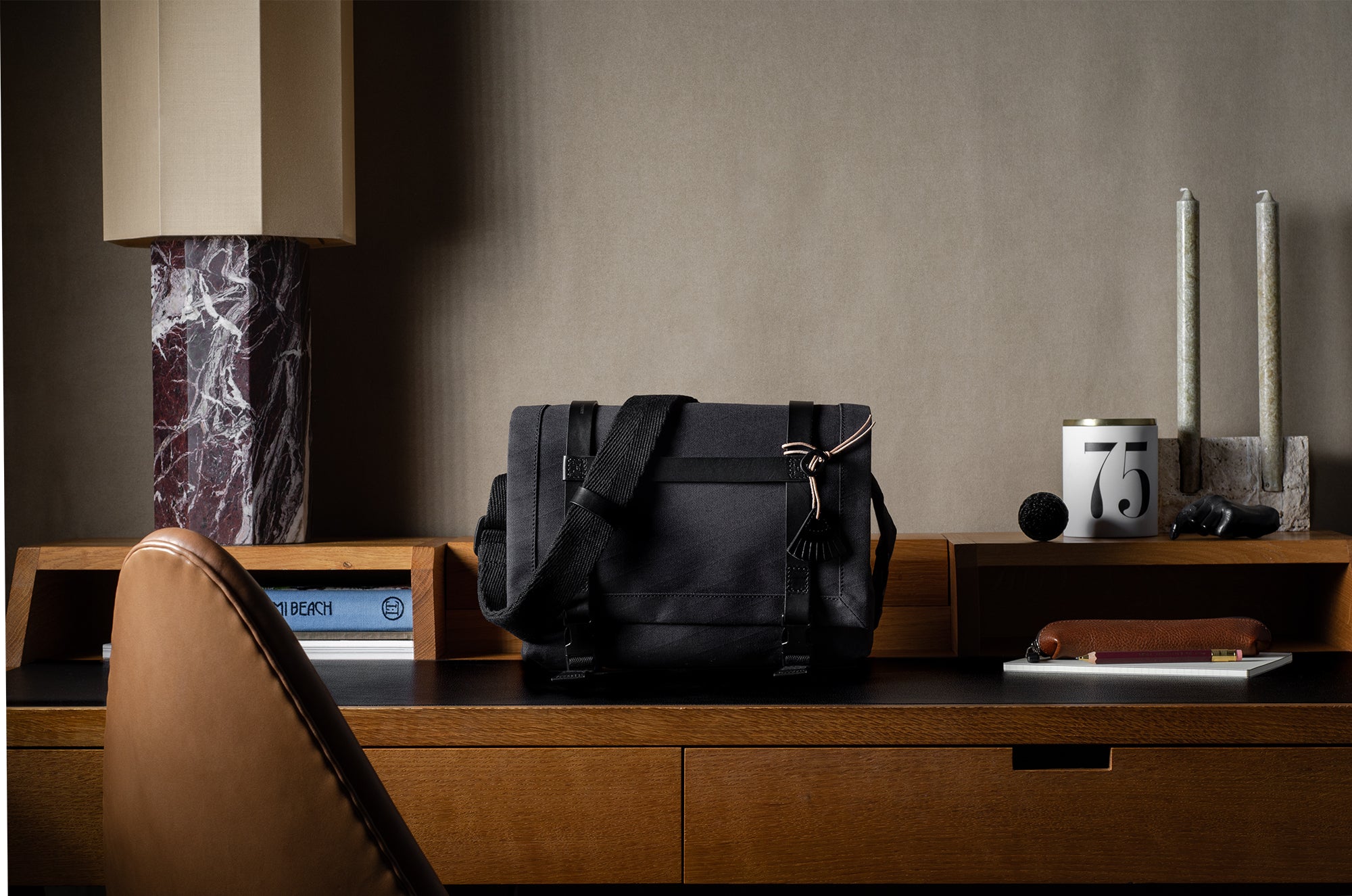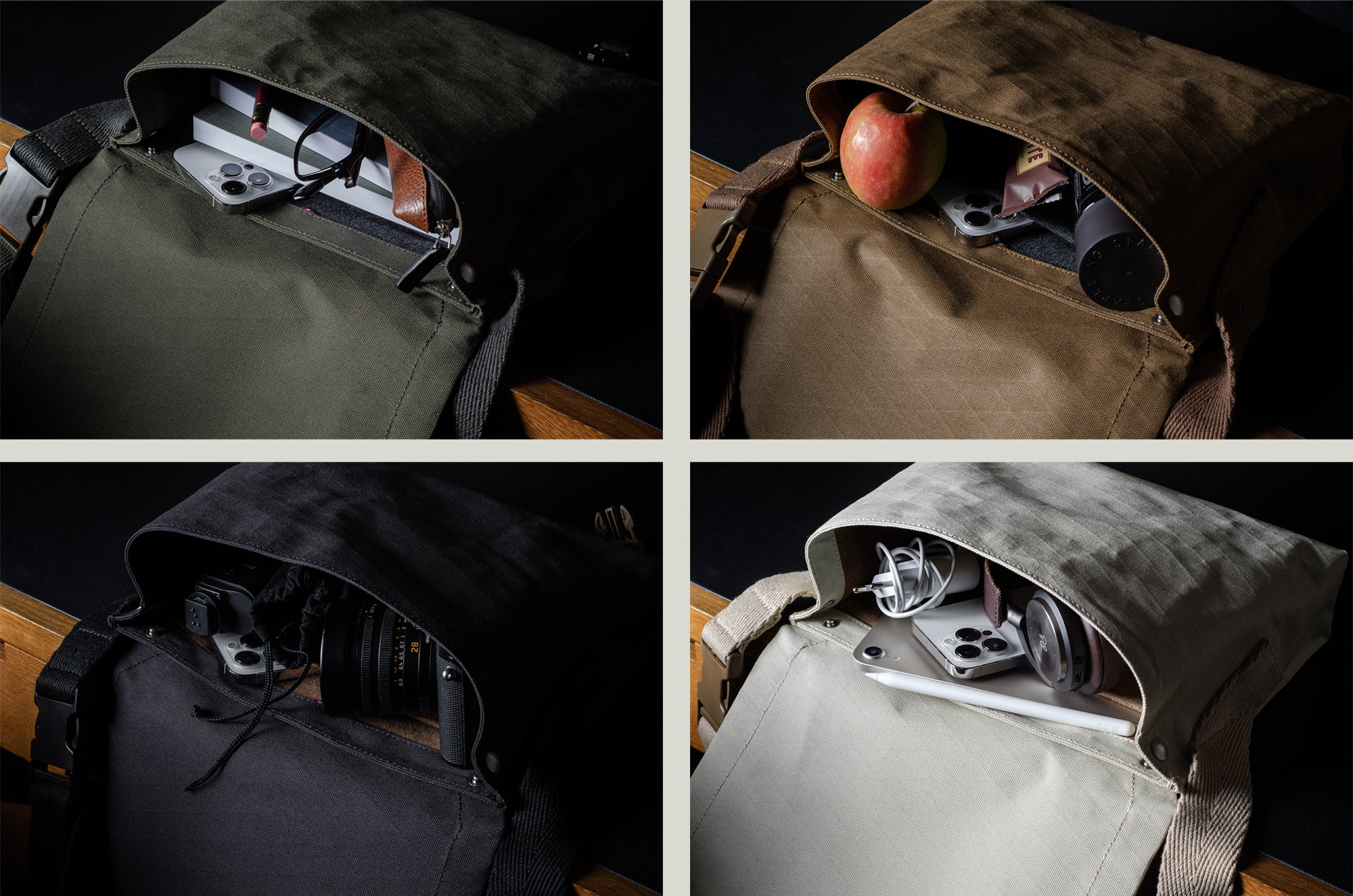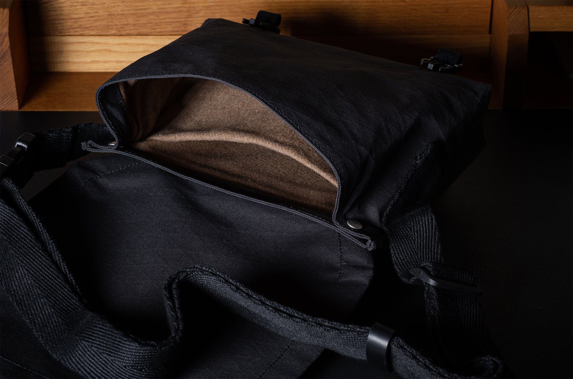Inspired by advanced sailcloth technology this layered material is durable, resilient, weatherproof and high-tech. The natural organic duck cotton face is combined with a double layer laminate construction to achieve ultimate strength, lightness and weatherproofness. 100% climate neutral.
