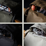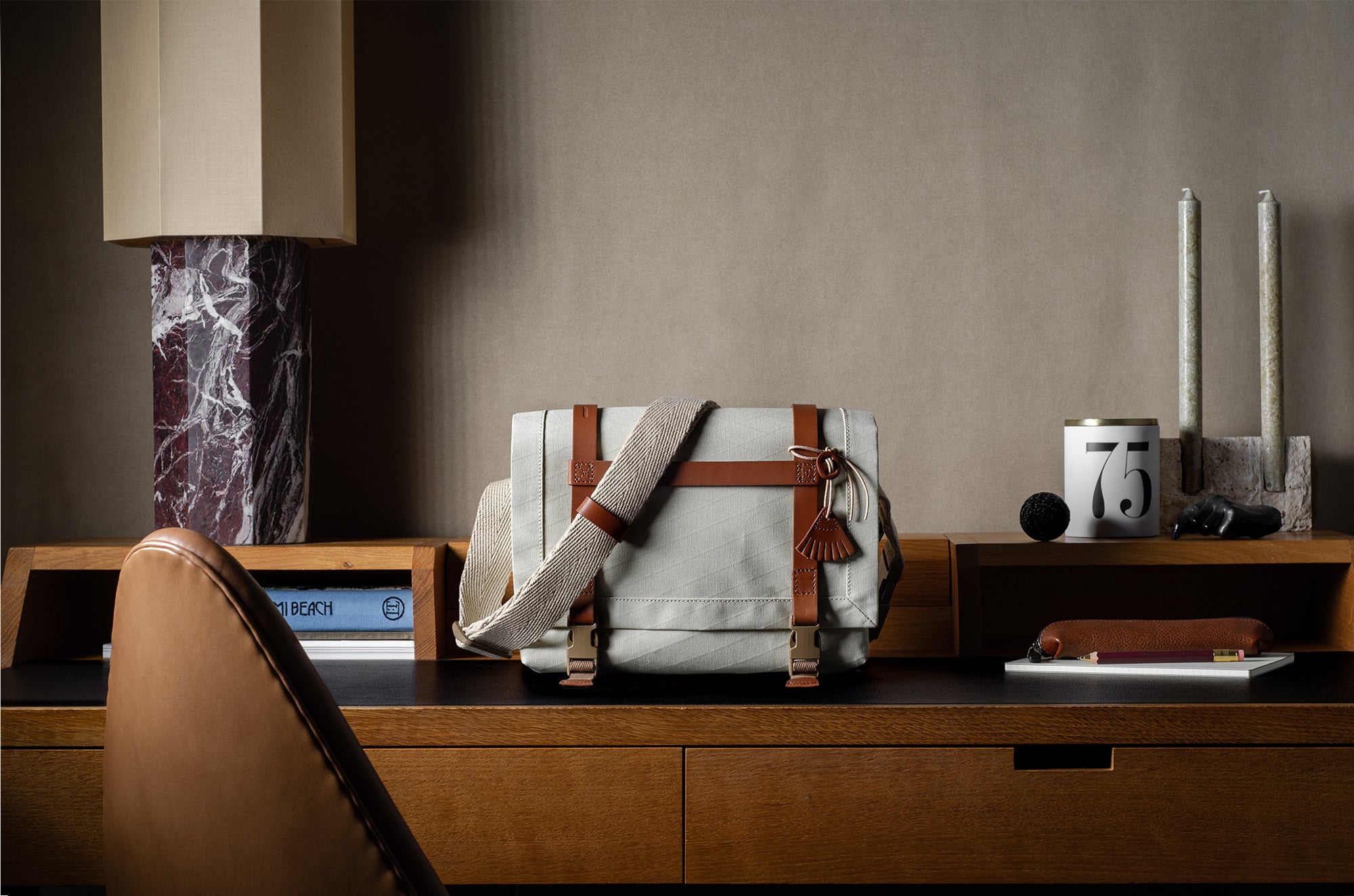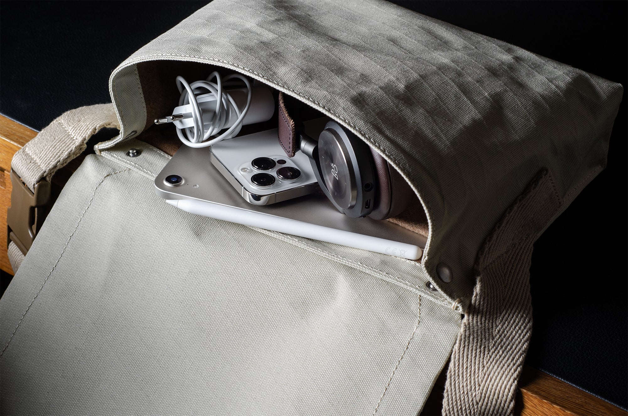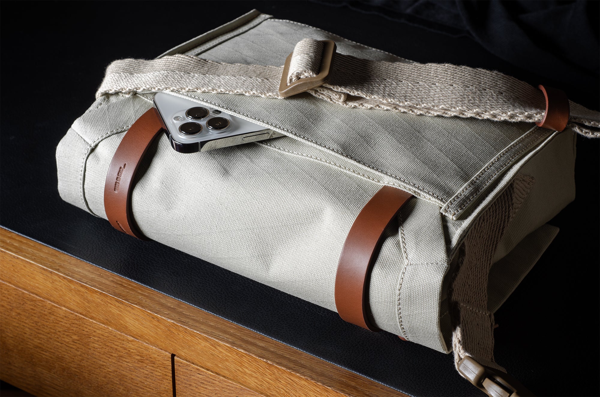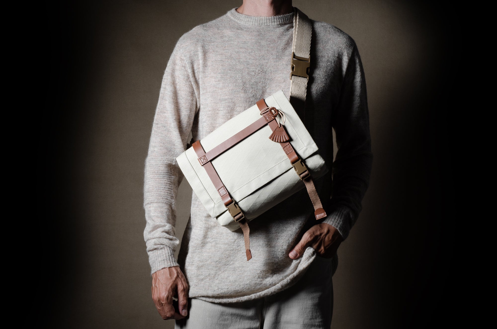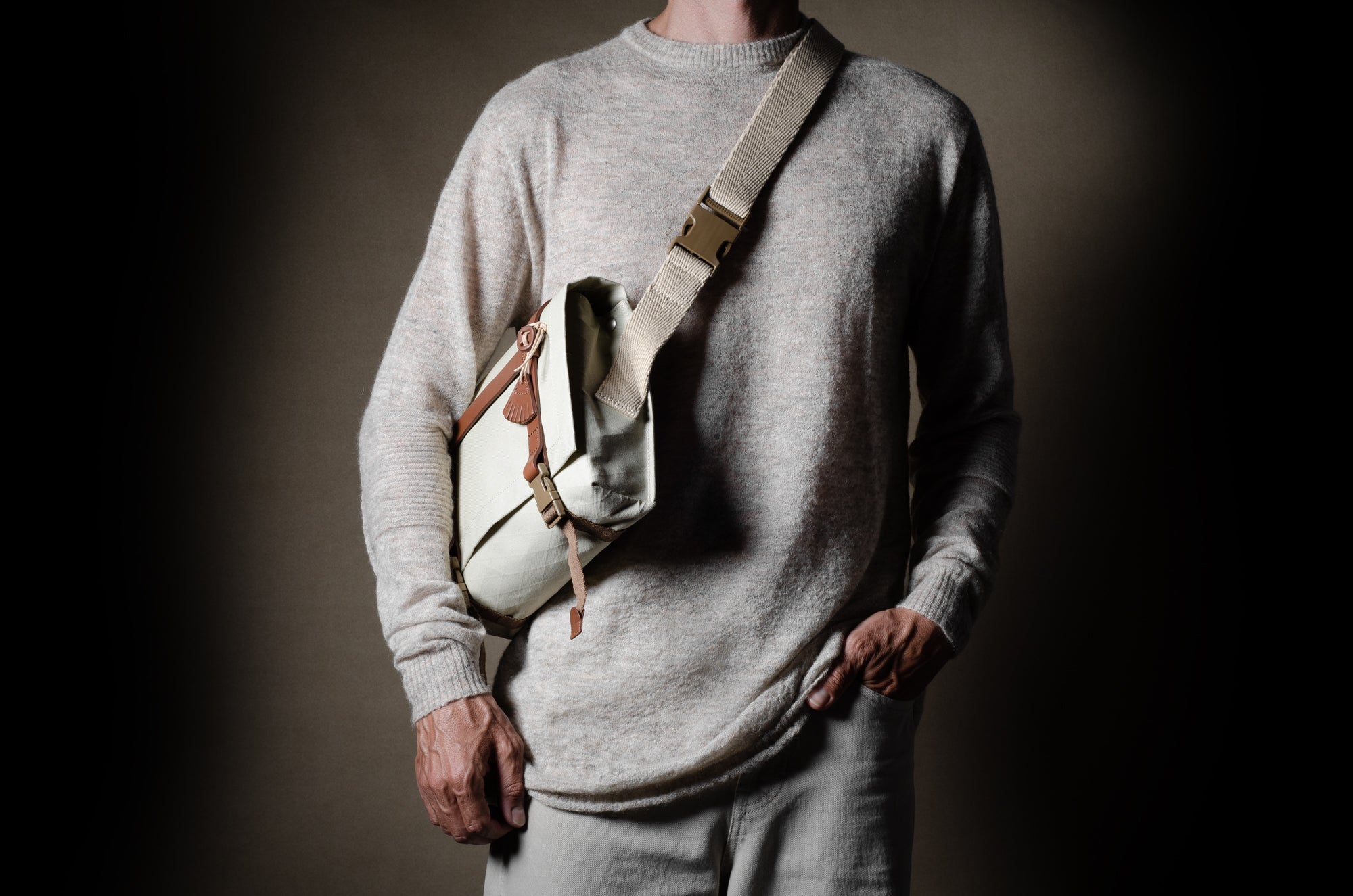 Inspired by advanced sailcloth technology this layered material is durable, resilient, weatherproof and high-tech. The natural organic duck cotton face is combined with a double layer laminate construction to achieve ultimate strength, lightness and weatherproofness. 100% climate neutral.