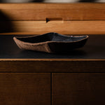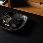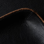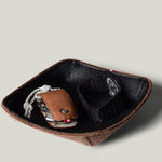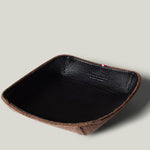 Ihr „ Taschenleerer “ ist in drei Größen erhältlich. Das kleine Quadrat, das Sie gerade betrachten, misst 11,5 x 11,5 cm / 4,5 x 4,5 Zoll und besteht aus sattem schwarzem, pflanzlich gegerbtem Leder, das sorgfältig auf eine Basis aus weicher brauner Filzwolle montiert wurde. Clevere Nähte heben die vier Ecken sanft an und bilden so das raffinierte Valet-Tablett . Dieses Meisterwerk der klassischen Kombination von Hartgraft-Materialien wird von unseren Kunsthandwerkern in Italien hergestellt.