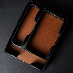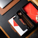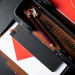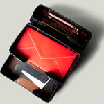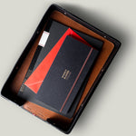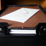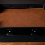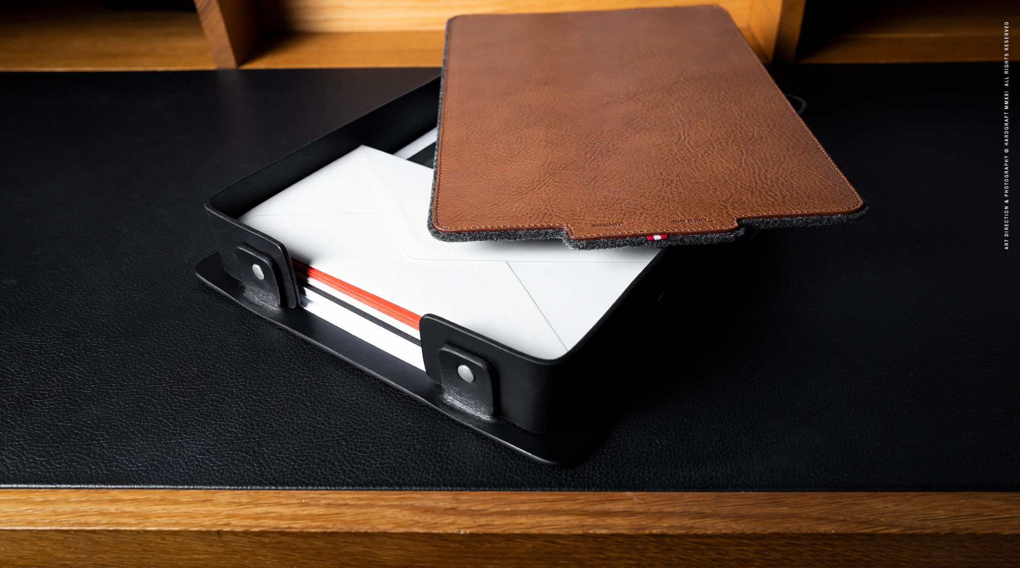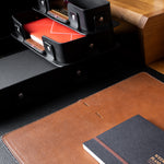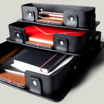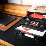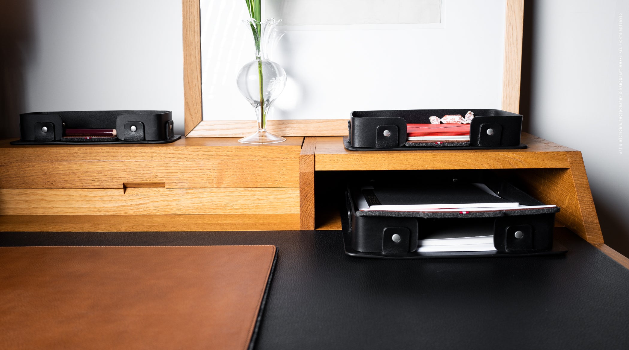 Das Inbox Tray Trio Set besteht aus drei robusten, aber biegsamen Ledertabletts. Jedes Tablett verfügt über einen einzigartigen und cleveren Einsatz oder Deckel aus Leder und gefilzter Wolle, der auch als Trennwand verwendet werden kann. Bewahren Sie Ihre archivierten Briefe und Notizen unten und die wichtigen Teile oben auf. Die Abmessungen der Fächer sind wie folgt: Das große Fach passt auf Standardpapier (A4 und US-Letter-Format) 23cm x 31cm x 4cm sind die Maße des mittleren Tabletts 23cm x 12cm x 4cm (passend für Faltbriefe und die meisten Briefumschläge) und das kleine Fach ist 23 cm x 6 cm x 4 cm und passt für Stifte und Sonstiges. Alles in Italien aus pflanzlich gegerbtem Leder hergestellt – das schwarze Leder ist dickes Gürtelleder mit unserem satten klassischen hellbraunen Leder und gefilzter Wolle für die Trennwand.