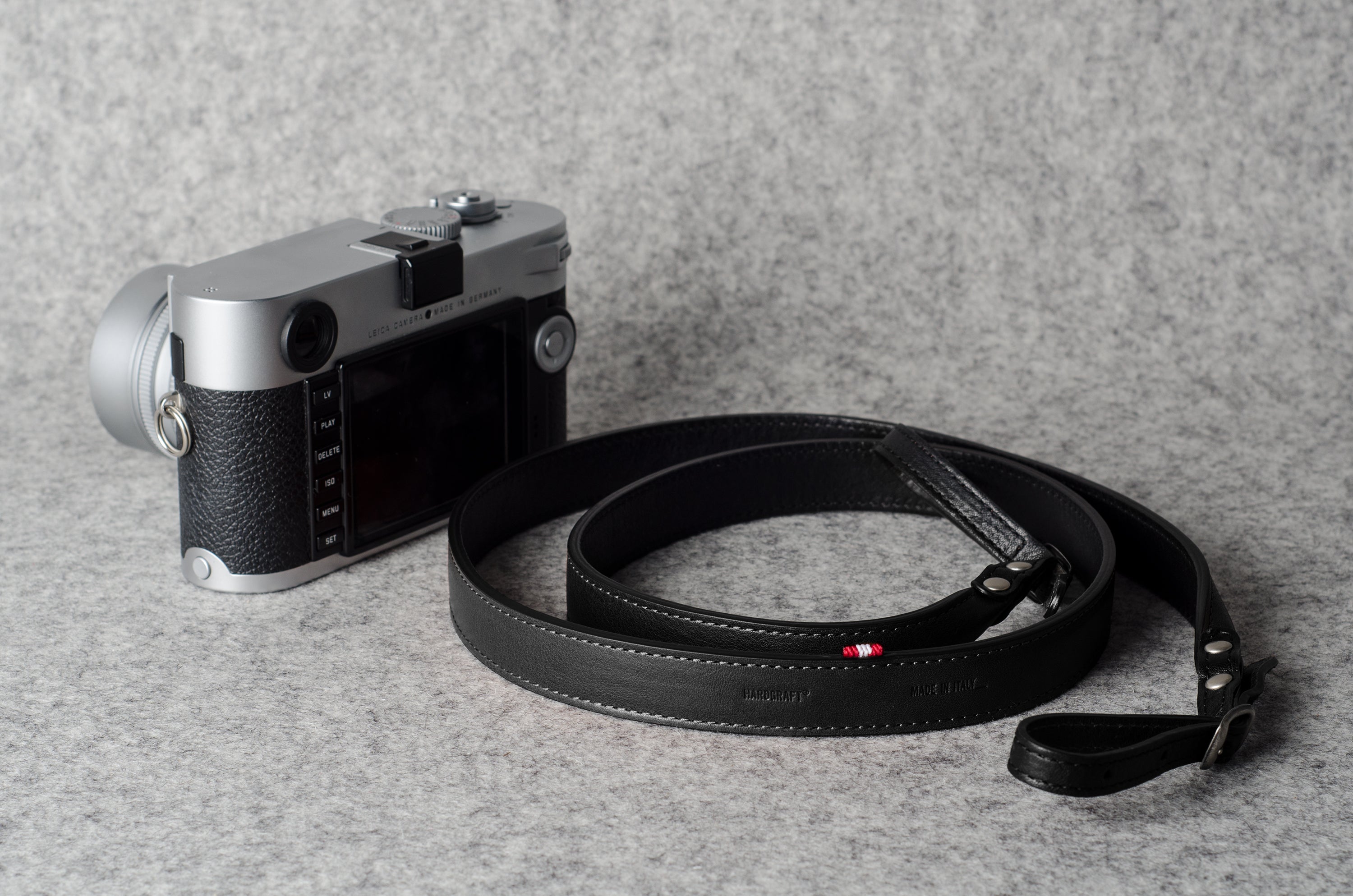 Ein Hardgraft- Designklassiker , der schon von weitem zu erkennen ist, ohne auffällig zu wirken. Es zeichnet sich durch einen einzigartigen Design-Balanceakt aus zwei kontrastierenden Ledern aus, die harmonisch zusammenarbeiten. Der Kameragurt enthält Metallspaltringe mit einem Durchmesser von 1 cm und funktioniert mit den meisten Kameras. Die Länge ist verstellbar von ca. 120 bis 130 cm (47" - 51"). Die Kamera hängt ca. 58 cm vom Hals entfernt. Hergestellt in Italien.