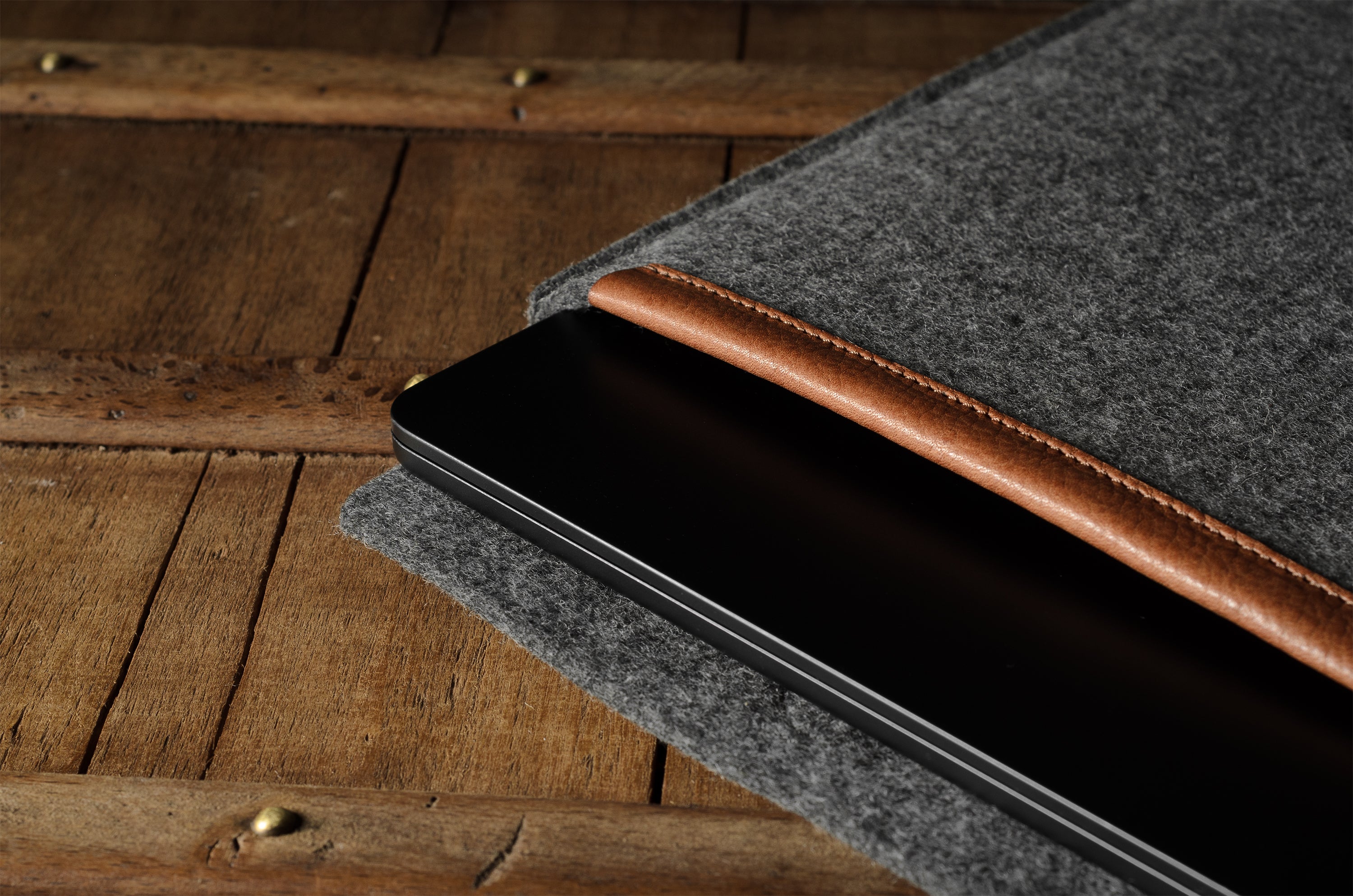 Gray wool felt laptop sleeve with brown leather on a wooden surface